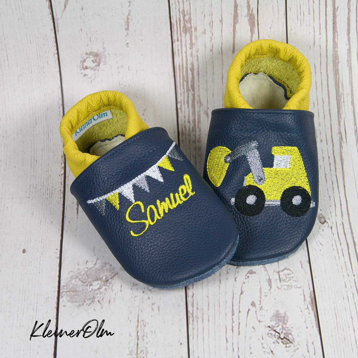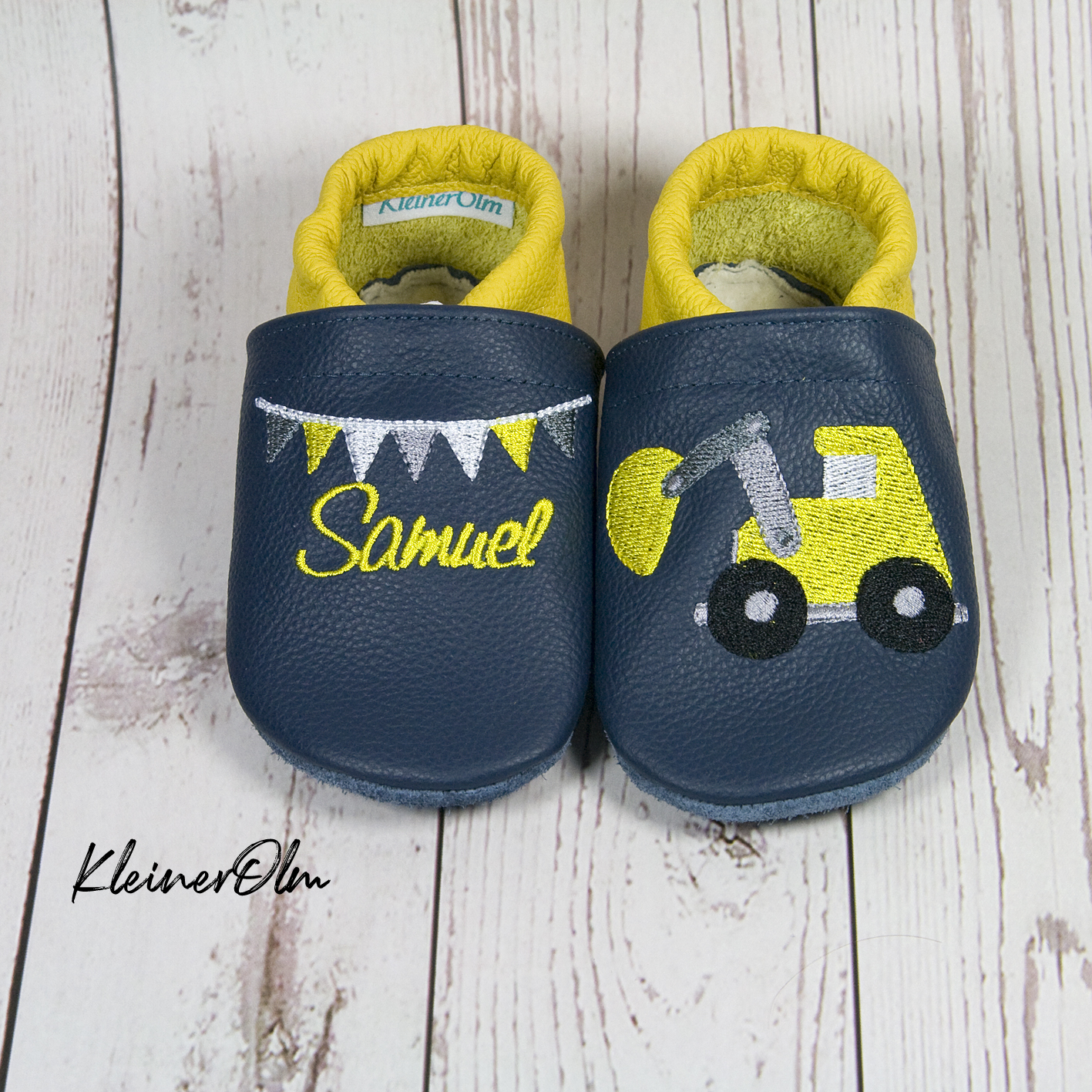 Mit Bagger, Namen und Wimpelkette bestickt.