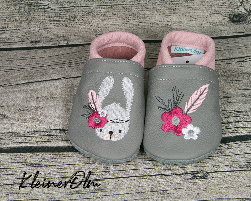 Mit süßem FederHasen und Blumenfeder bestickt.