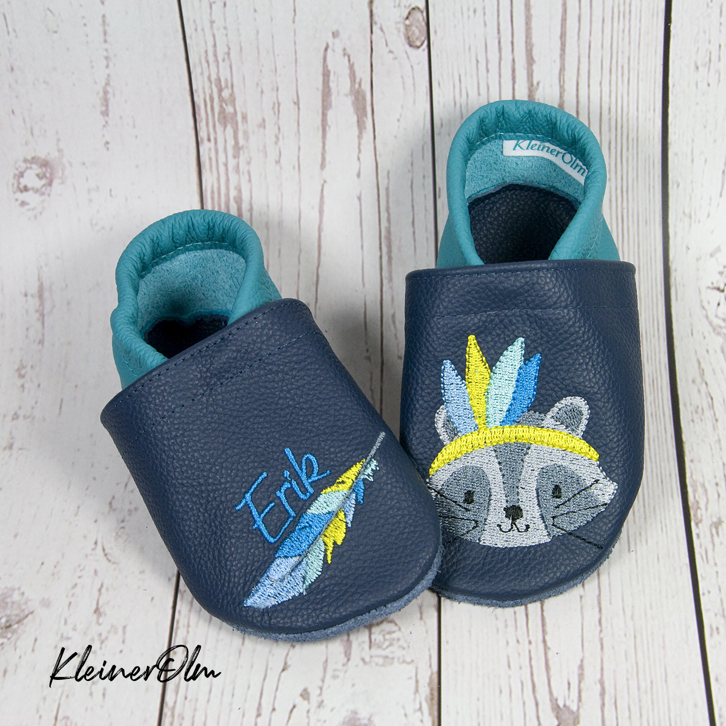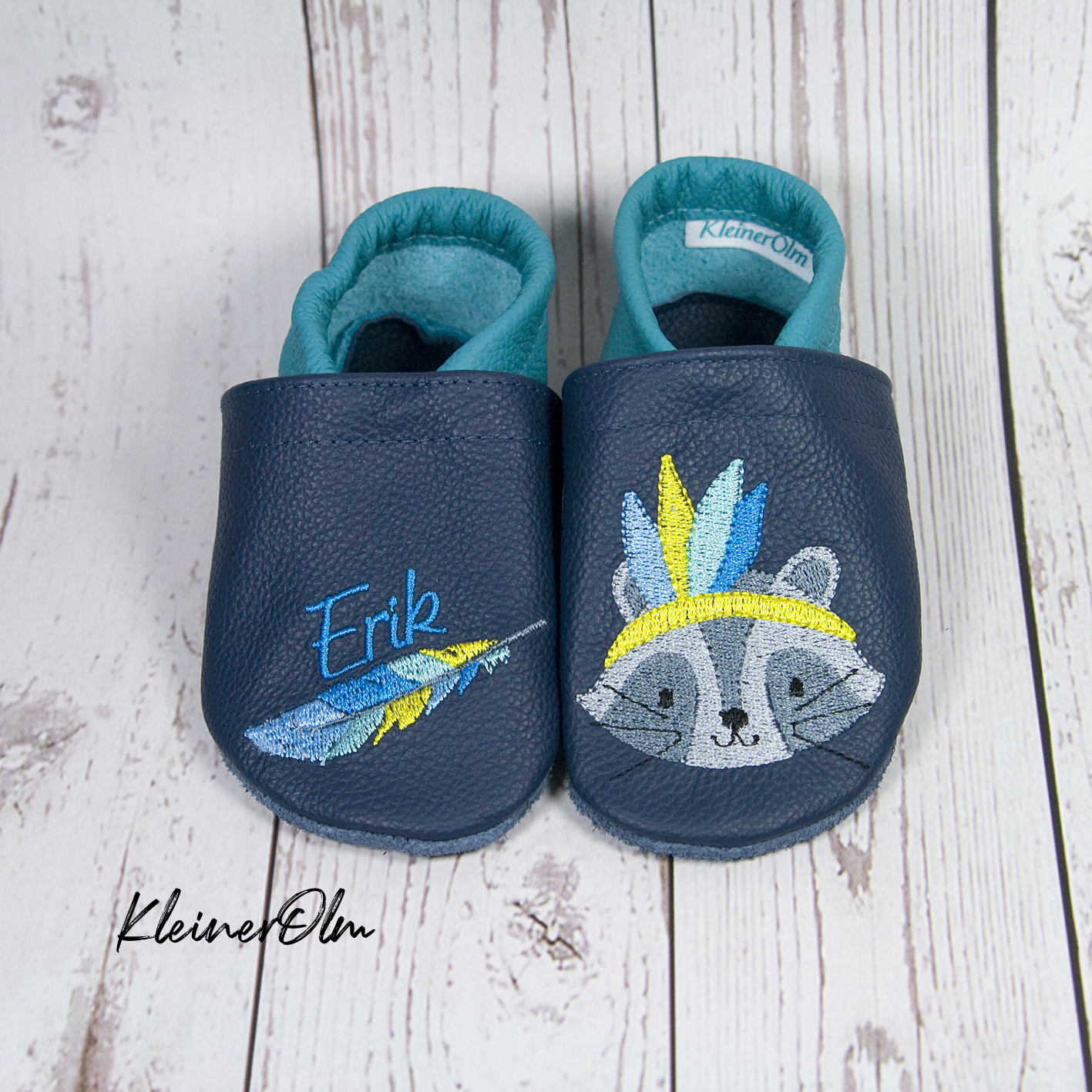 Mit süßem Boho Feder Waschbär und Namen bestickt.